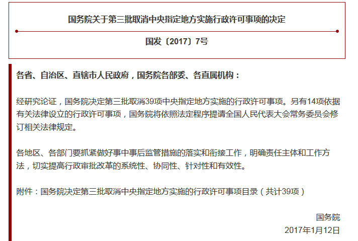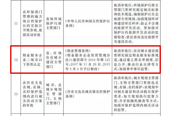 •       1月12日,国务院印发《关于第三批取消中央指定地方实施行政许可事项的决定》,明确在前两批取消230项审批事项的基础上,再取消39项中央指定地方实施的行政许可事项。其中包括由《物业服务企业资质管理办法》(建设部令2004年第125号,2007年11月26日、2015年5月4日予以修改)规定的,由省、市级住房城乡建设主管部门审批的“物业服务企业二级及以下资质认定”被正式取消。国务院要求,取消审批后,住房城乡建设部要研究制定物业服务标准规范,通过建立黑名单制度、信息公开、推动行业自律等方式,加强事中事后监管。